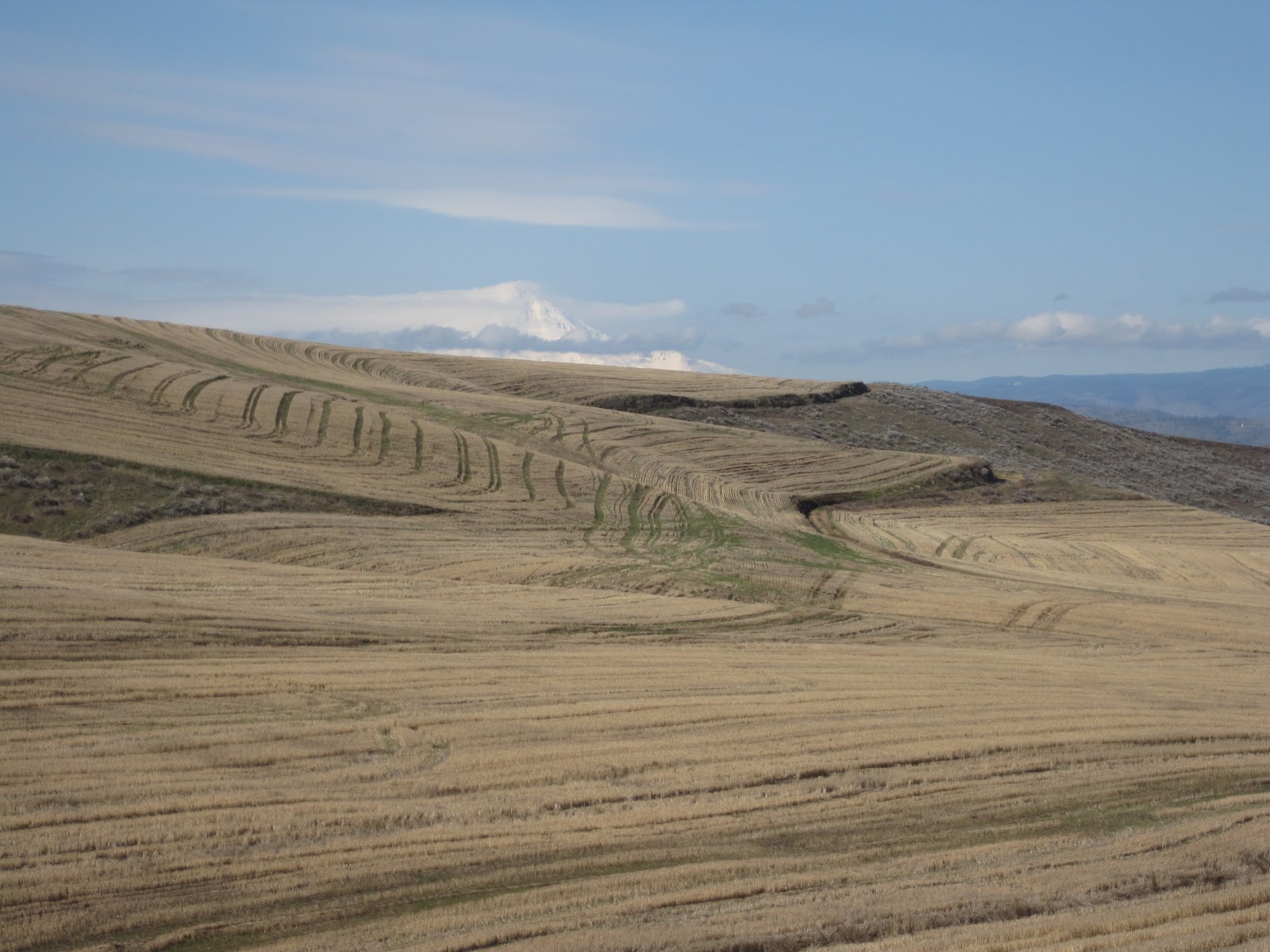 Always a reward: Mt. Hood in the distance over the old wheat, the lines of hard work, the tractors. Throughout this ride I got to see Mt. Hood and Mt. Adams, all mystery and fiction. Just beautiful.